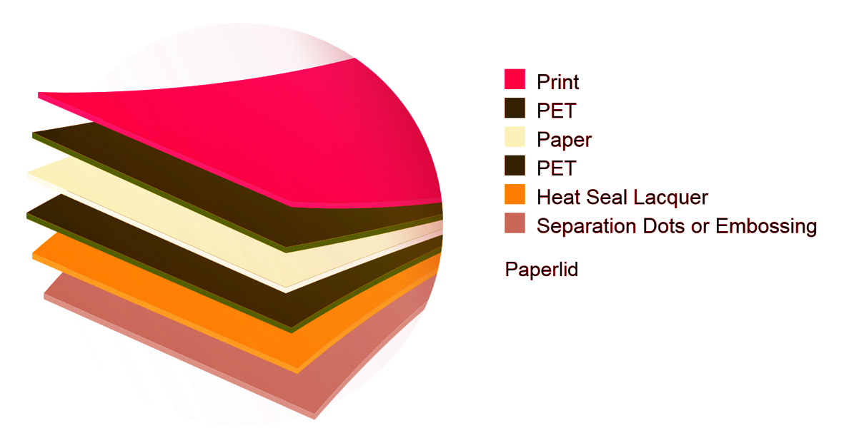 Paperlid Paperlid is a 3-layer aluminum free die cut lid composed of a heatseal lacquered PET/Paper/PE laminate. Available embossed and unembossed. Sealing against PS, PP and PLA -cups.